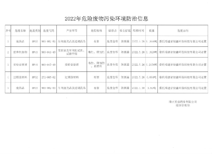 無(wú)極藥業(yè)有限公司2022年危險(xiǎn)廢物污染環(huán)境防治信息