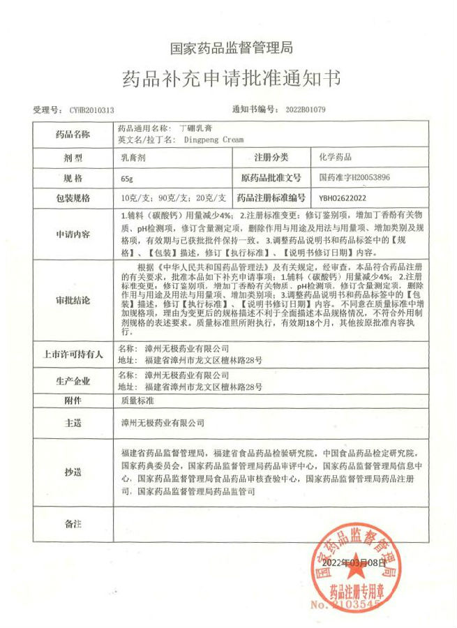 2018年9月無(wú)極公司啟動(dòng)丁硼乳膏質(zhì)量提升工作,在技術(shù)中心、質(zhì)量管理部、生產(chǎn)部等部門與北京CRO公司的通力協(xié)作下,歷時(shí)3年多,經(jīng)過實(shí)驗(yàn)室小試、中試、商業(yè)批次放大生產(chǎn)以及產(chǎn)品的穩(wěn)定性考察、資料申報(bào)各個(gè)環(huán)節(jié),無(wú)極公司于2022年3月8日收到國(guó)家藥品監(jiān)督管理局藥品補(bǔ)充申請(qǐng)批準(zhǔn)通知書,丁硼乳膏質(zhì)量提升補(bǔ)充申請(qǐng)正式獲得國(guó)家藥監(jiān)局批準(zhǔn)。